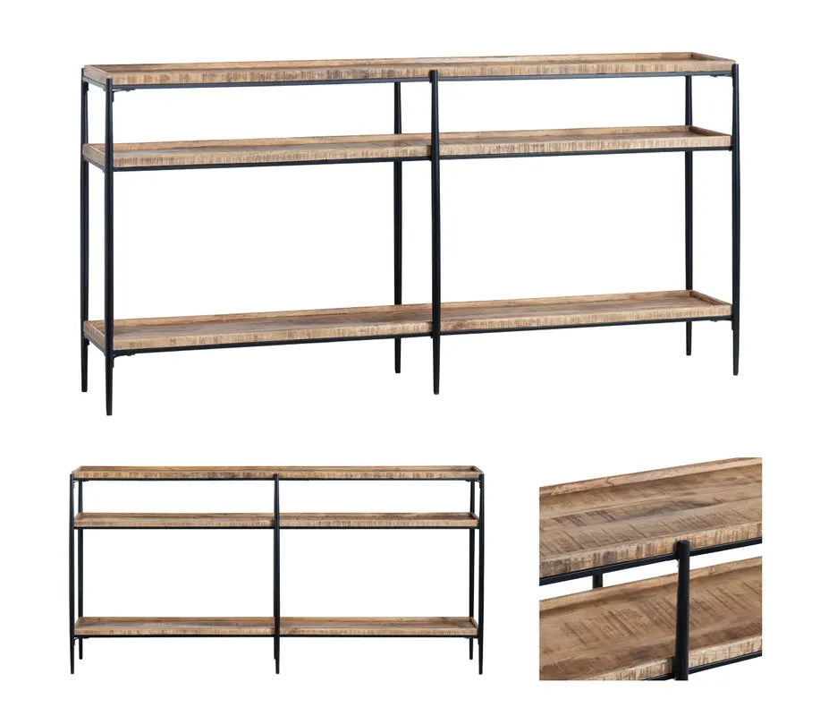 Introducing the Gloucestershire Console Table at Homenclature, a captivating blend of functionality and rustic-inspired elements. This tiered design features a matte black, metal frame with three, full-length natural mango wood shelves. The earthy tones of the wood are on full display and coated with a clear varnish for added protection and durability. Open and airy, this console table is guaranteed to elevate your organic-modern or bohemian themed entryway, living room or dedicated entertaining space.