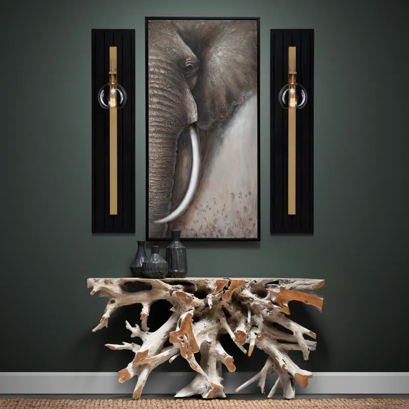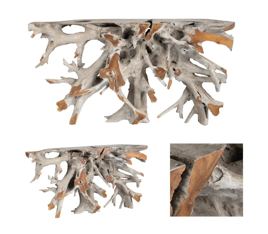 Elevate your interior with the LionaLight Natural Teak Console Table at Homenclature. A masterful work of high-modern art, this design features a weave of natural teak wood branches assembled together to form a table silhouette. Finished in a stunning combination of earthy brown and gray tones, this textural piece highlights the captivating beauty of mother nature while allowing for functionality with a flat top for display lamps and accessories. This spectacular juxtaposition of rugged and ultra-contemporary design is sure to be the focal point in your grand entryway or formal dining room.